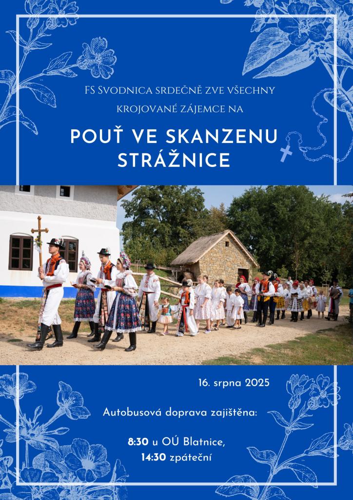 Pokud by měl někdo z Blatničanů zájem se k procesí ve Strážnici připojit a prožít si atmosféru skanzenu, tak to není problém, jedinou podmínkou je účast v kroji - svátečním, polosvátečním. Na místě je k dispozici šatna. Doprava autobusem je zajištěna, ten odjíždí v sobotu v 8:30 hod přesně od OÚ Blatnice. Návrat zpět je do 15 hod nejpozději. Občerstvení na místě je zajištěno, bude také vyplaceno krojovné.