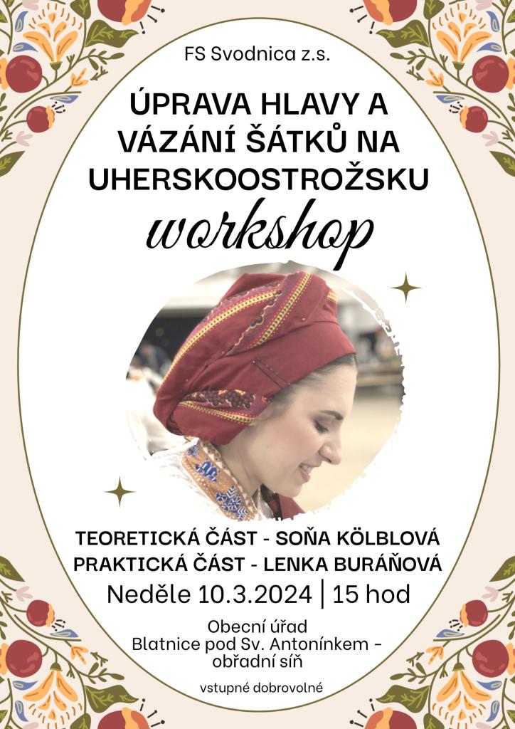 FS Svodnica , z.s. pořádá v neděli 10.3.2024 od 15 hodin v obřadní síni OÚ workshop pro všechny zájemce o úpravu hlavy a vázání šátků. Vstupné dobrovolné.